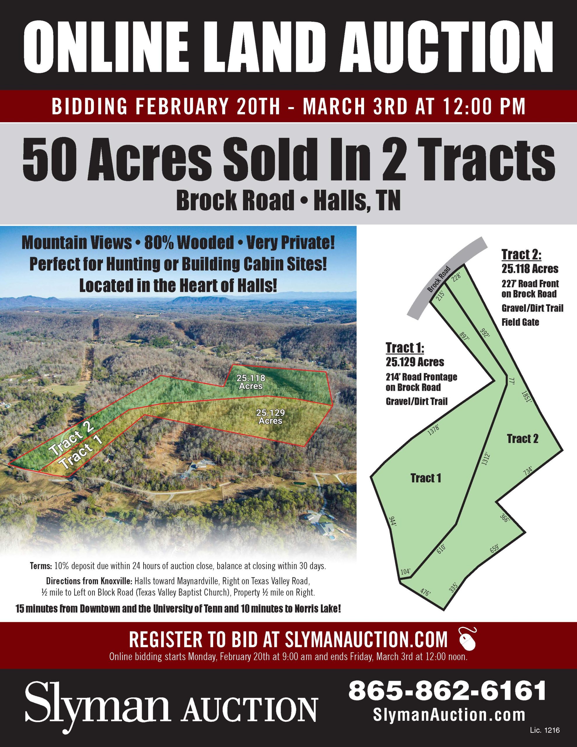 Directions: From Food City in Halls, go 4 miles toward Maynardville, turn (R) onto Texas Valley Road (Sunoco gas station), go 1/2 mile, turn (L) onto Brock Road (Texas Valley Baptist Church), property will be 1/2 mile on the right.